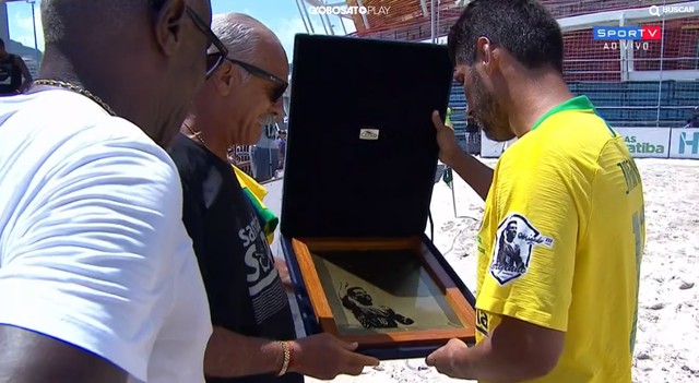 Jorginho, que também vestiu uma camisa 10, recebeu uma placa comemorativa de seus ex-parceiros de seleção de futebol de areia Júnior, ex-craque do Flamengo e hoje comentarista da TV Globo, e Cláudio Adão.
