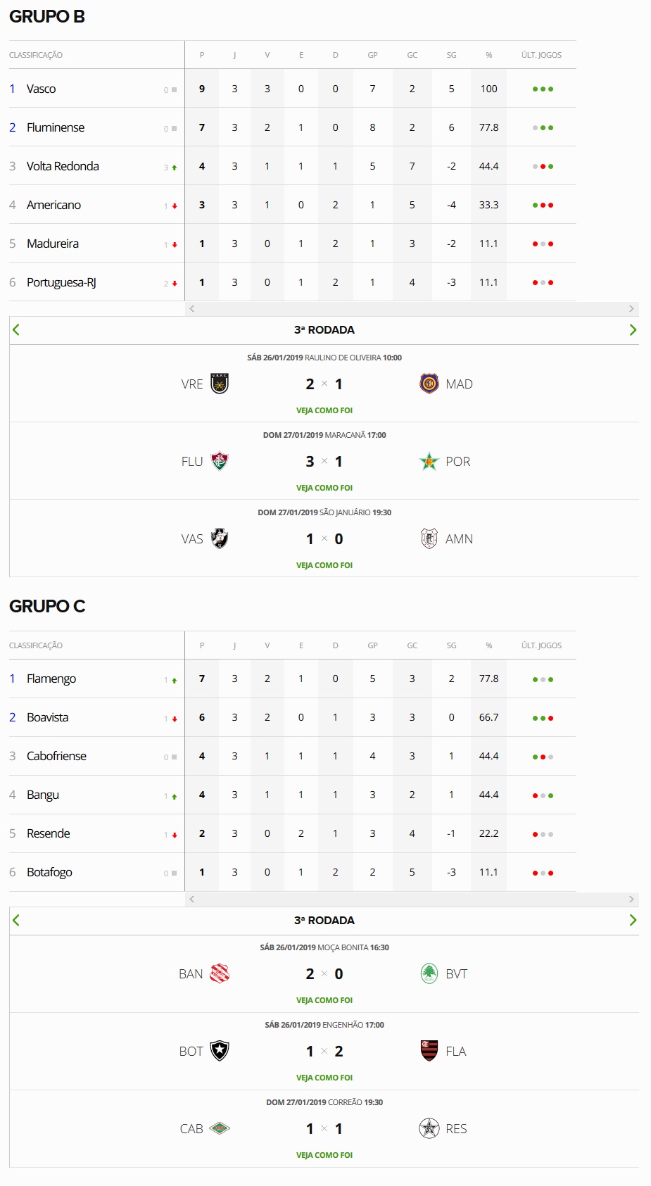 Terminada a 3ª rodada da fase de grupos da Taça Guanabara, o Vasco, que venceu o Americano por 1 a 0, segue líder isolado do Grupo B. O Gigante da Colina é o único clube com 100% de aproveitamento na Taça GB.