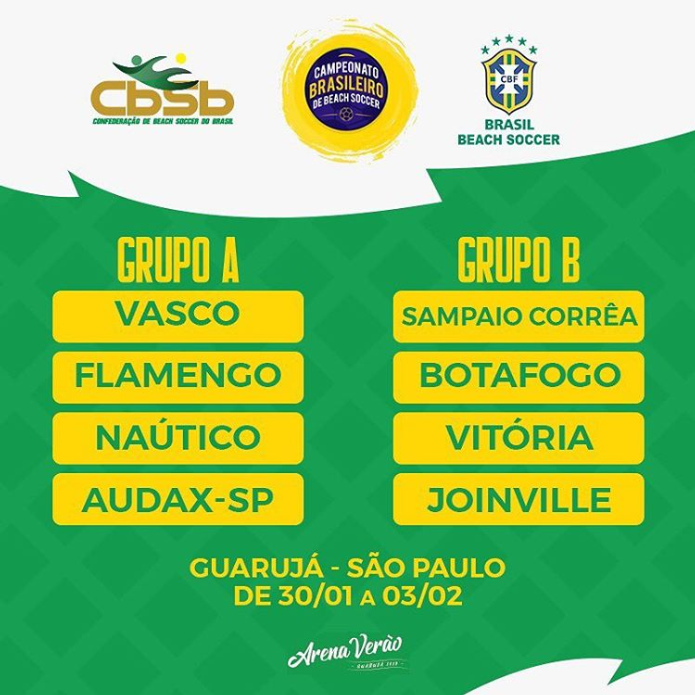Definidos os grupos do Campeonato Brasileiro de Beach Soccer, que será realizado no Guarujá, em São Paulo, de 30/1 a 3/2: