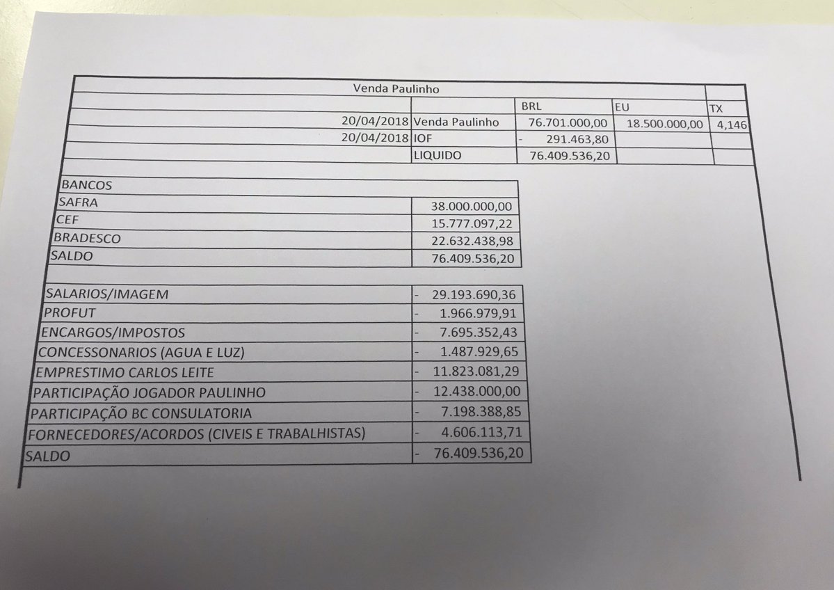 Documentos mostram detalhamento dos valores gastos com a venda de Paulinho; confira