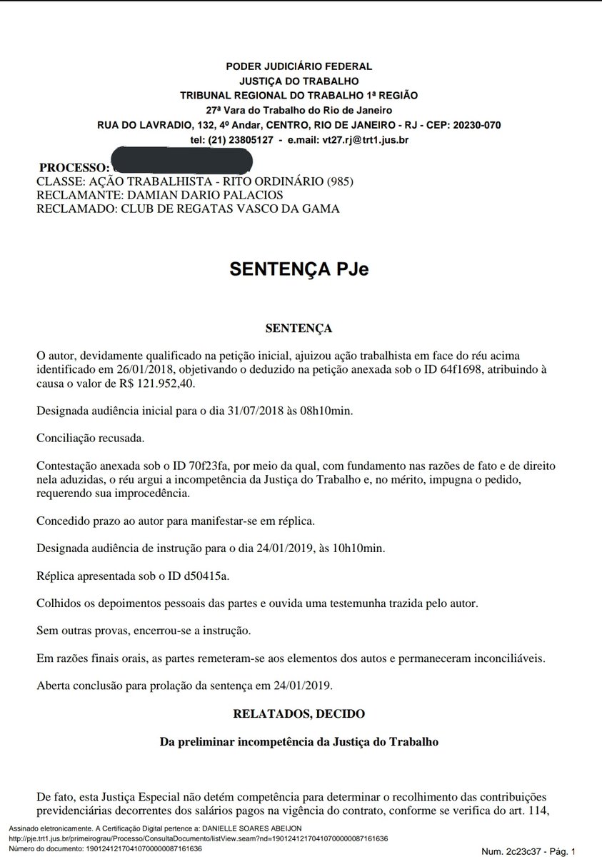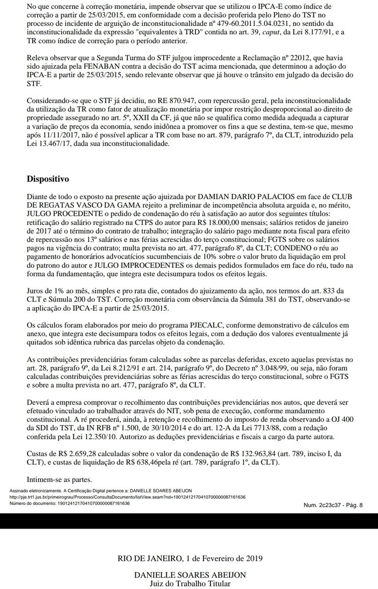 A juíza Danielle Soares Abeijon, da 27a Vara do Trabalho do TRT-1, acaba de condenar o Vasco a pagar R$ 132.963,84 a Damian Palacios, jogador de basquete que atuou pelo clube em um dos últimos NBB. Cabe recurso ao Cruz-Maltino. Já já íntegra do caso no @lancenet. Espia #lanceVAS