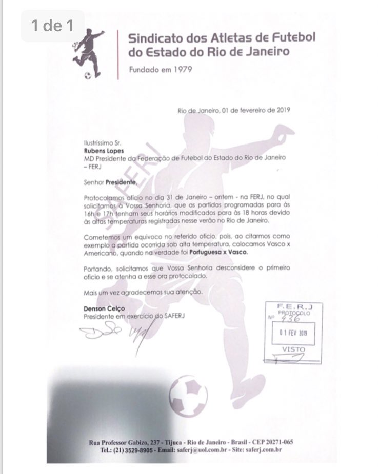 Veja documento em que o Sindicato dos Atletas do RJ pede que jogos comecem a partir das 18h