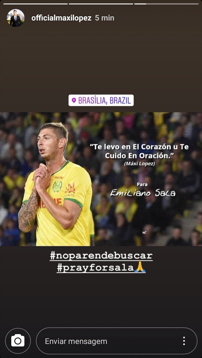 Via Instagram, Maxi López se solidarizou com o desaparecimento do avião que levava o compatriota Emiliano Sala para Cardiff. O argentino usou as tags #noparendebuscar e #PrayForSala.
