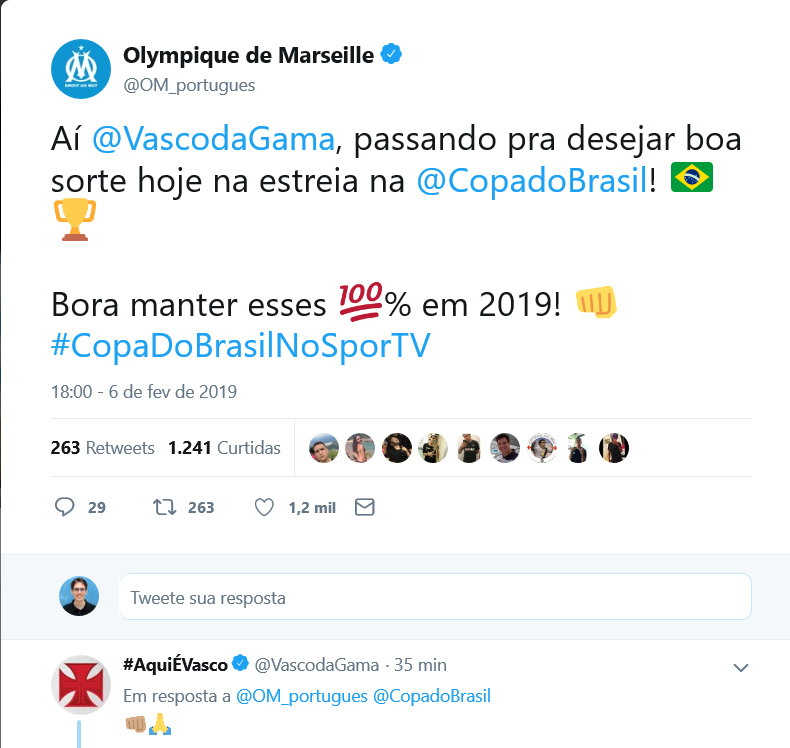 Em rede social, Olympique de Marselha deseja boa sorte na estreia da Copa do Brasil ao Vasco, que responde; veja