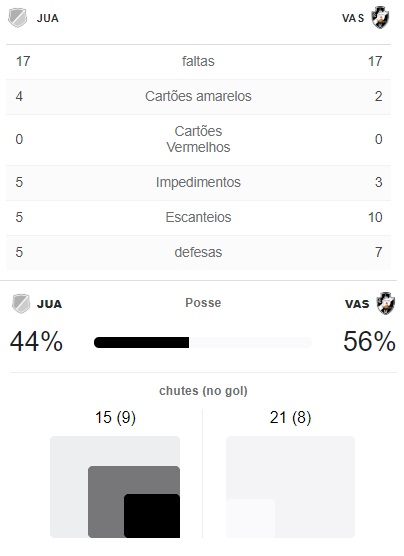 Somente na parte final, o jogo voltou a ficar movimentado. O Vasco quase marcou o segundo aos 39 minutos. Yan Sasse chutou da antrada da área e obrigou Douglas a fazer grande defesa. O Juazeirense respondeu com Balotelli, mas Fernando Miguel estava atento para imoedir o empate. Com isso, os cariocas foram para o intervalo a frente no placar em Juazeiro.