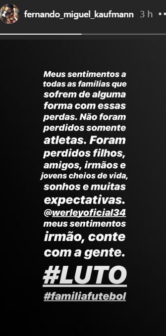 Hoje, todos somos um time só. Sonhos foram interrompidos por uma tragédia que comove a todos, principalmente a nós jogadores que sabemos como é estar longe da família para lutar por nosso sonho. Meus sentimentos aos familiares e funcionários! Muita força a todos nesse momento tão difícil.