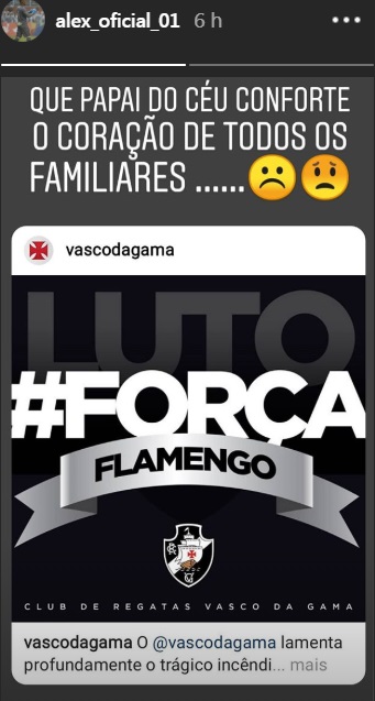 Muito ruim acordar com a notícia dessa tragédia onde crianças tiveram seus sonhos de se tornarem atletas profissionais ceifados de uma forma tão cruel neste incêndio. Eu morei em alojamento grande parte da minha vida, sei o quão difícil é. Hoje o futebol perdeu a cor, não tem rivalidade. Mas sim a solidariedade e os pêsames por todas as vítimas desse trágico acidente. Que papai do Céu possa confortar o coração do familiares !!! #Luto🙏🏻😔