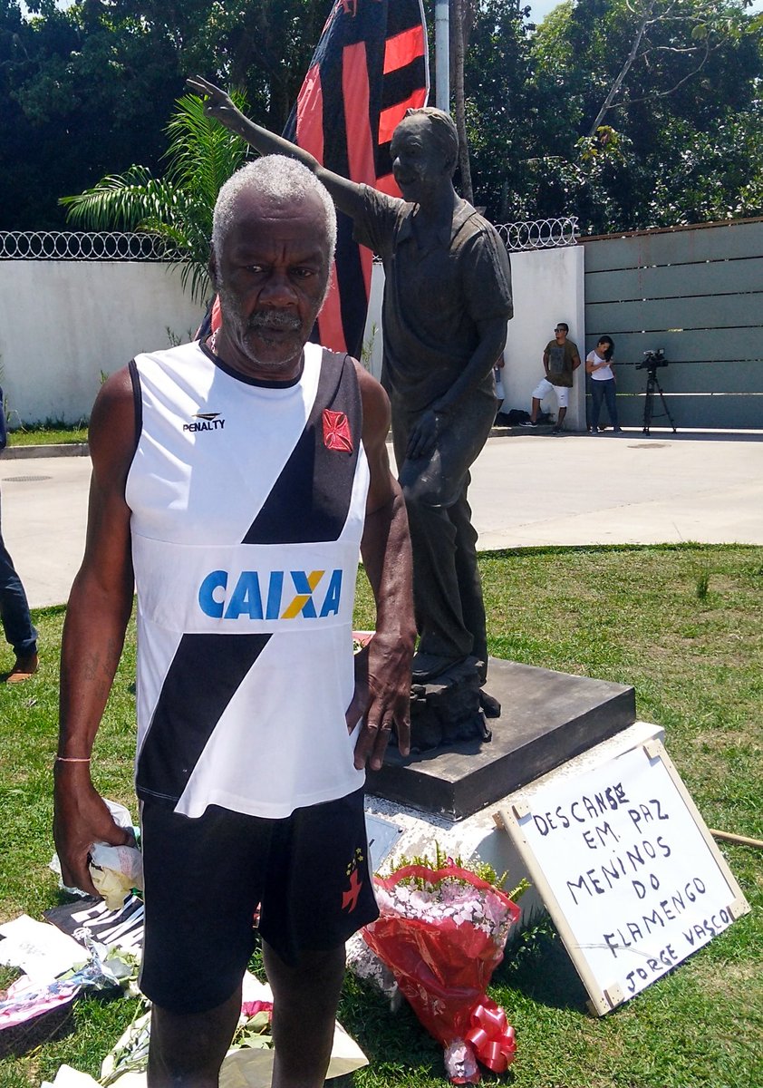 Seu Jorge, vascaíno da Taquara, bairro também da Zona Oeste do Rio, mas afastado daqui, veio trazer a sua homenagem. Disse que tem um neto de 4 anos que quer ser jogador e se emocionou com a tragédia do Ninho: "Sinto como se os conhecesse, como se fossem meus vizinhos" #gefla