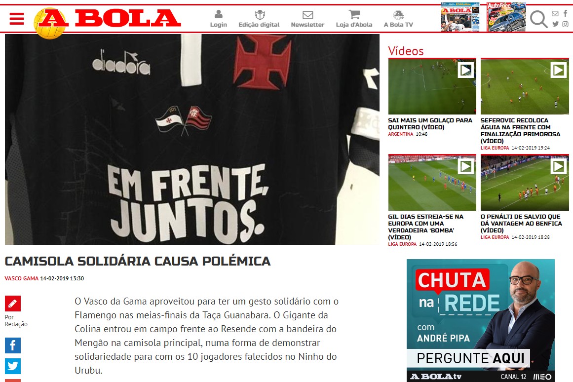 O Vasco da Gama aproveitou para ter um gesto solidário com o Flamengo nas meias-finais da Taça Guanabara. O Gigante da Colina entrou em campo frente ao Resende com a bandeira do Mengão na camisola principal, numa forma de demonstrar solidariedade para com os 10 jogadores falecidos no Ninho do Urubu.