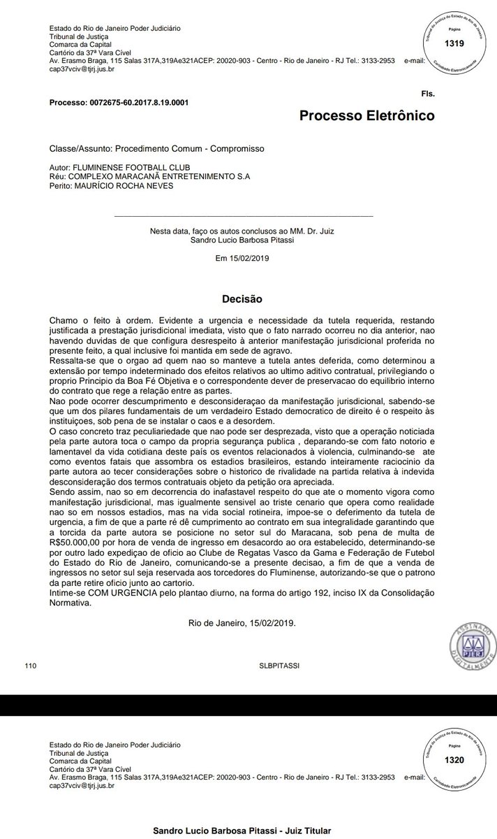 Juiz Sandro Lucio Pitassi, da 37a Vara Cível do Tribunal de Justiça do Rio de Janeiro, determina que para a final da Taça Guanabara o Fluminense fique no setor Sul do Maracanã. Multa de R$ 50 mil por hora de ingresso vendido em desacordo com a decisão. Espia #lanceFLU #lanceVAS