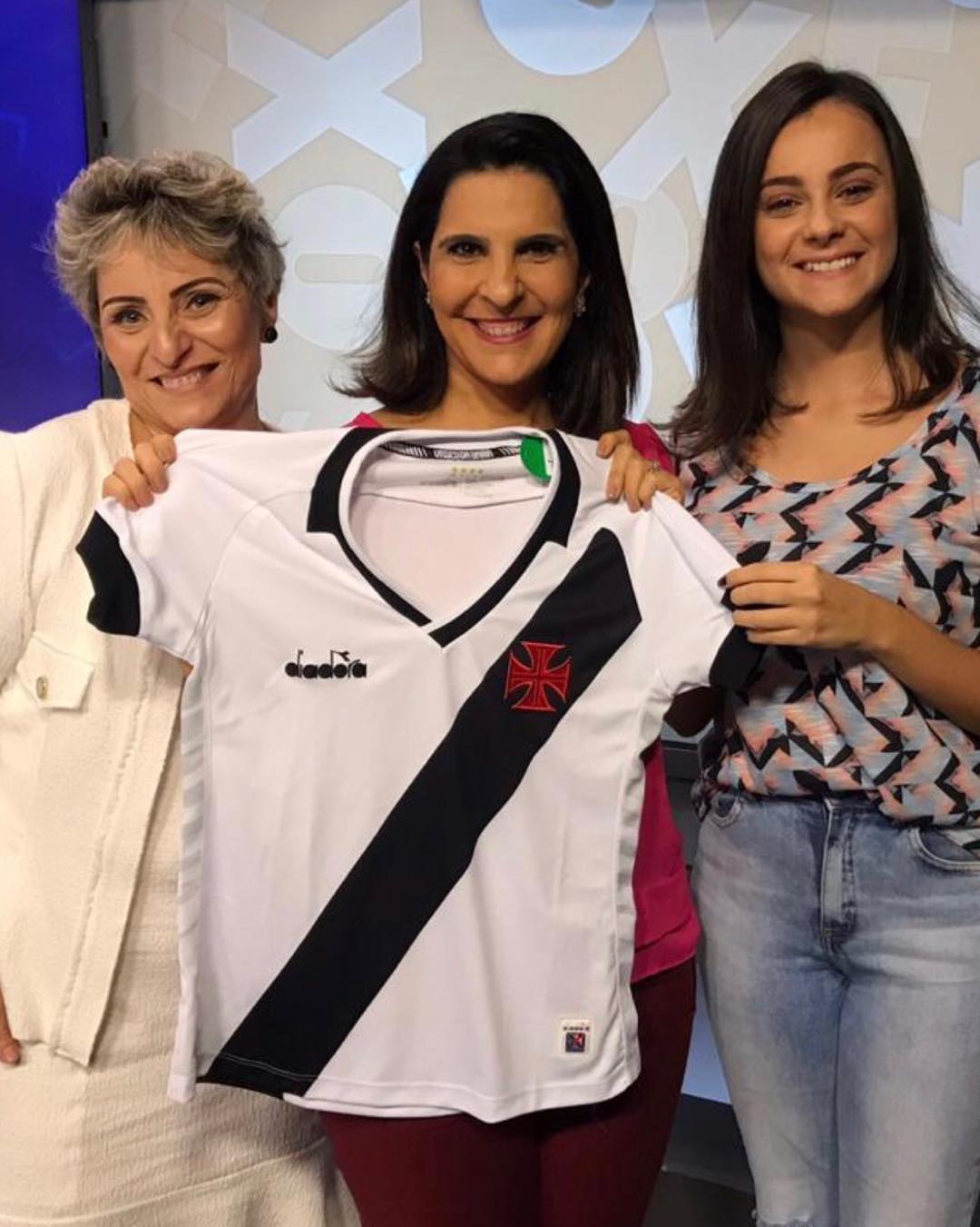 Sonia Andrade presenteia jornalista Vanessa Riche com camisa do Vasco
