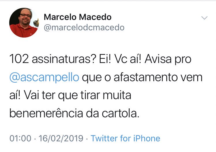 Vale ressaltar que, Marcelo Macedo é responsável pelo marketing do Sempre Vasco, grupo de Júlio Brant. Outros opositores do Casaca e Identidade Vasco também já se manifestaram pelo impeachment de Campello