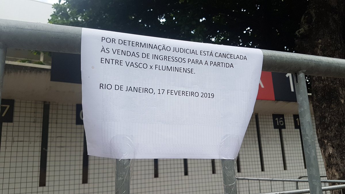 Foto mostra cartaz em frente à bilheteria do Maracanã com a informação do cancelamento da venda de ingressos