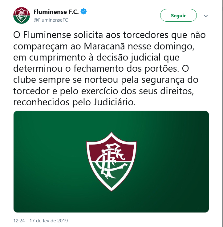 O Fluminense solicita aos torcedores que não compareçam ao Maracanã nesse domingo, em cumprimento à decisão judicial que determinou o fechamento dos portões. O clube sempre se norteou pela segurança do torcedor e pelo exercício dos seus direitos, reconhecidos pelo Judiciário.