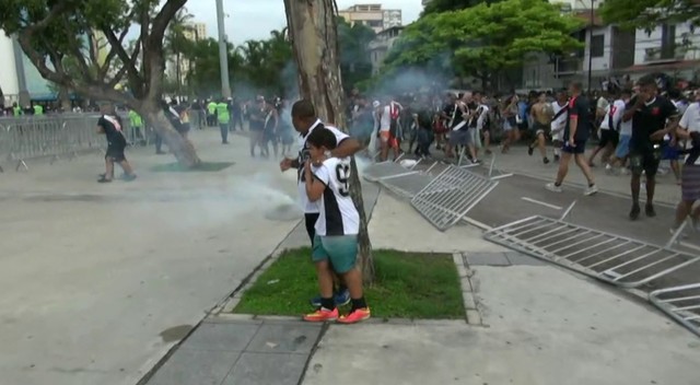 No meio do tumulto, torcedores saíram do confronto para comemorar um alarme falso do que seria um gol do Vasco. A cena inusitada logo foi reprimida com mais tiros de borracha.