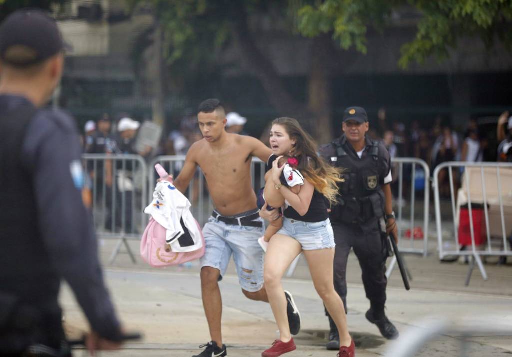 Torcedores do Vasco ficaram feridos na tarde deste domingo (17) após serem impedidos de entrar para ver a final da Taça Guanabara no Maracanã, Zona Norte do Rio. A Polícia Militar jogou bombas de efeito moral e alguns torcedores relataram o uso de balas de borracha e spray de pimenta.