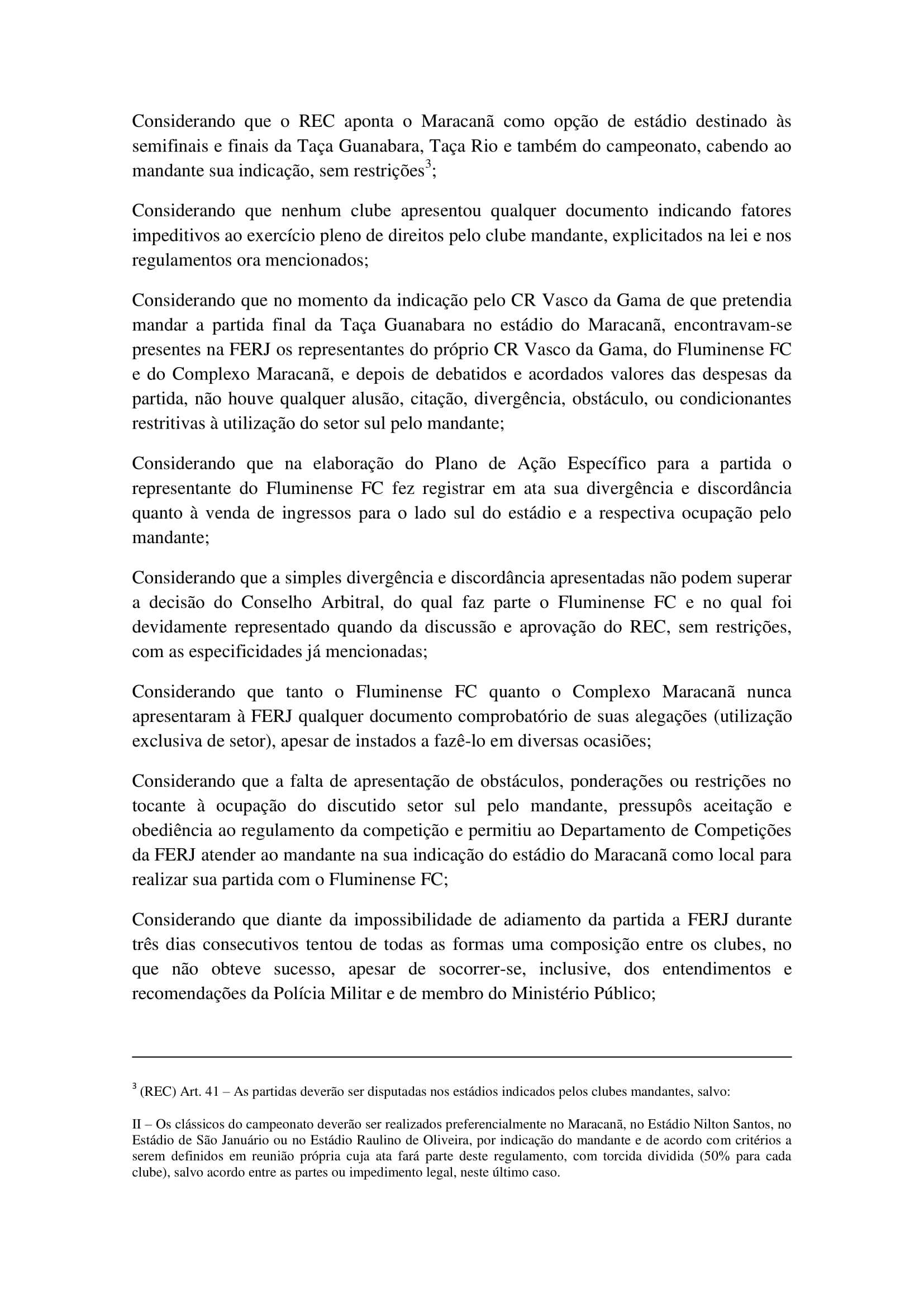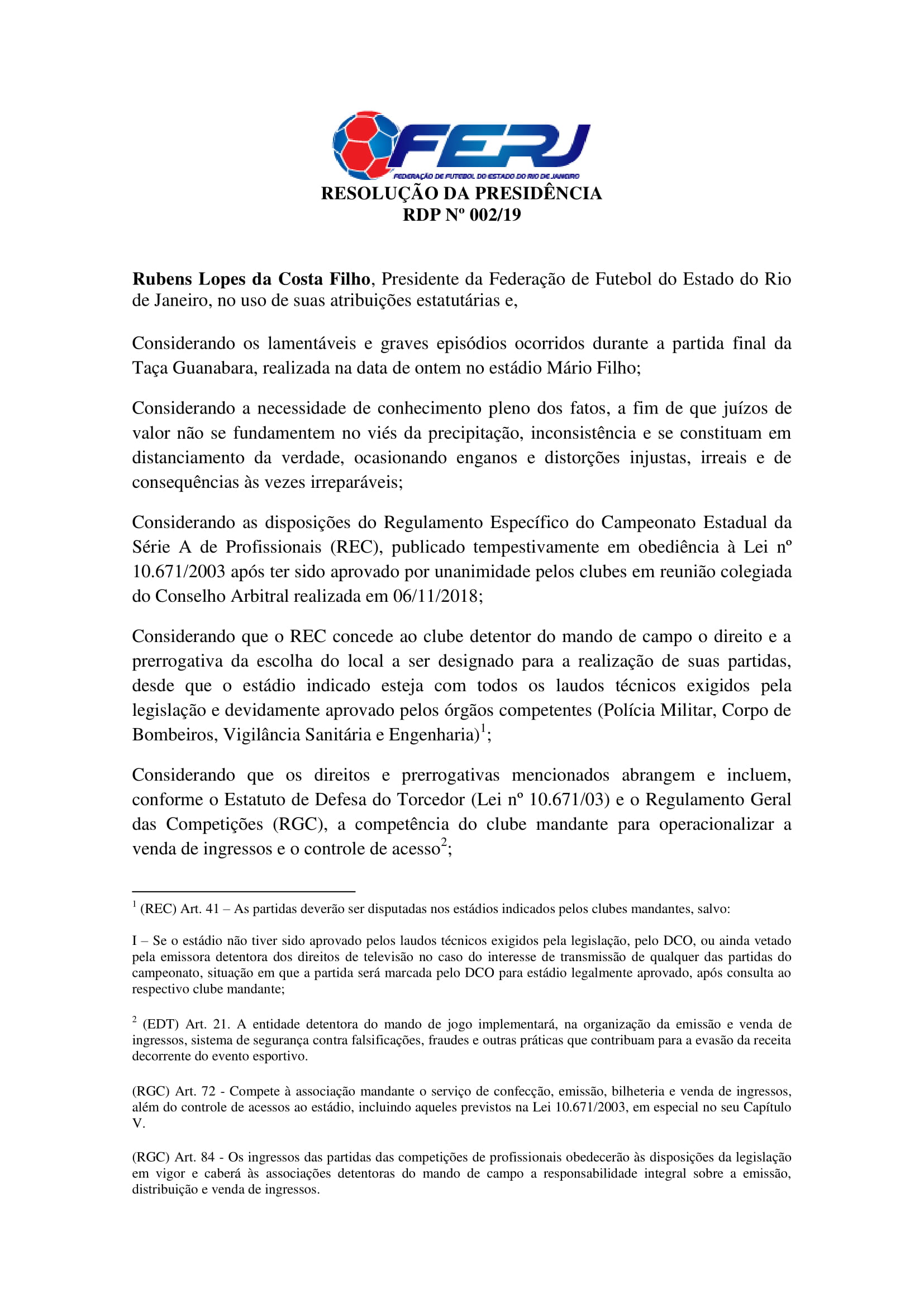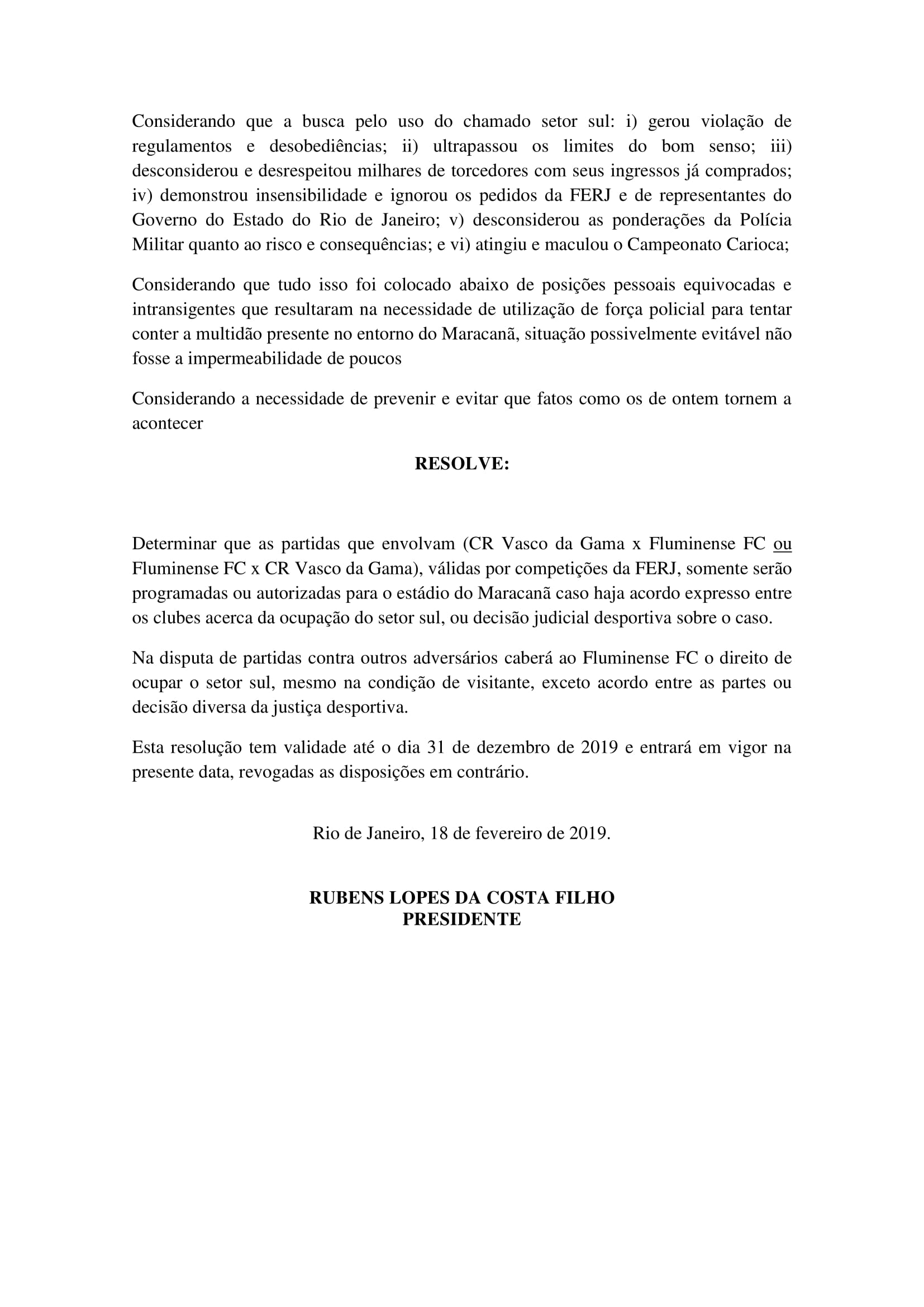 Após os lamentáveis episódios ocorridos antes do início da final da Taça Guanabara, entre Vasco da Gama e Fluminense, no último domingo (17/02), no Maracanã, a FERJ, através de uma Resolução da Presidência vem determinar que as partidas que envolvam as duas agremiações acima mencionadas, válidas pelo Campeonato Carioca, somente serão programadas e/ou autorizadas para o Maracanã caso haja acordo expresso entre os clubes acerca da ocupação do setor sul, ou decisão judicial desportiva sobre o caso.