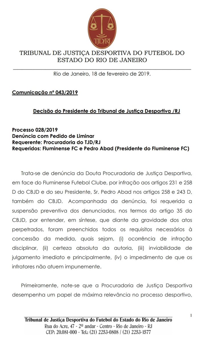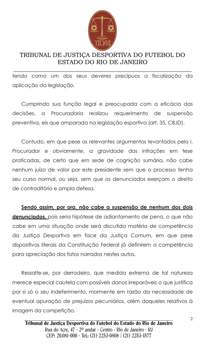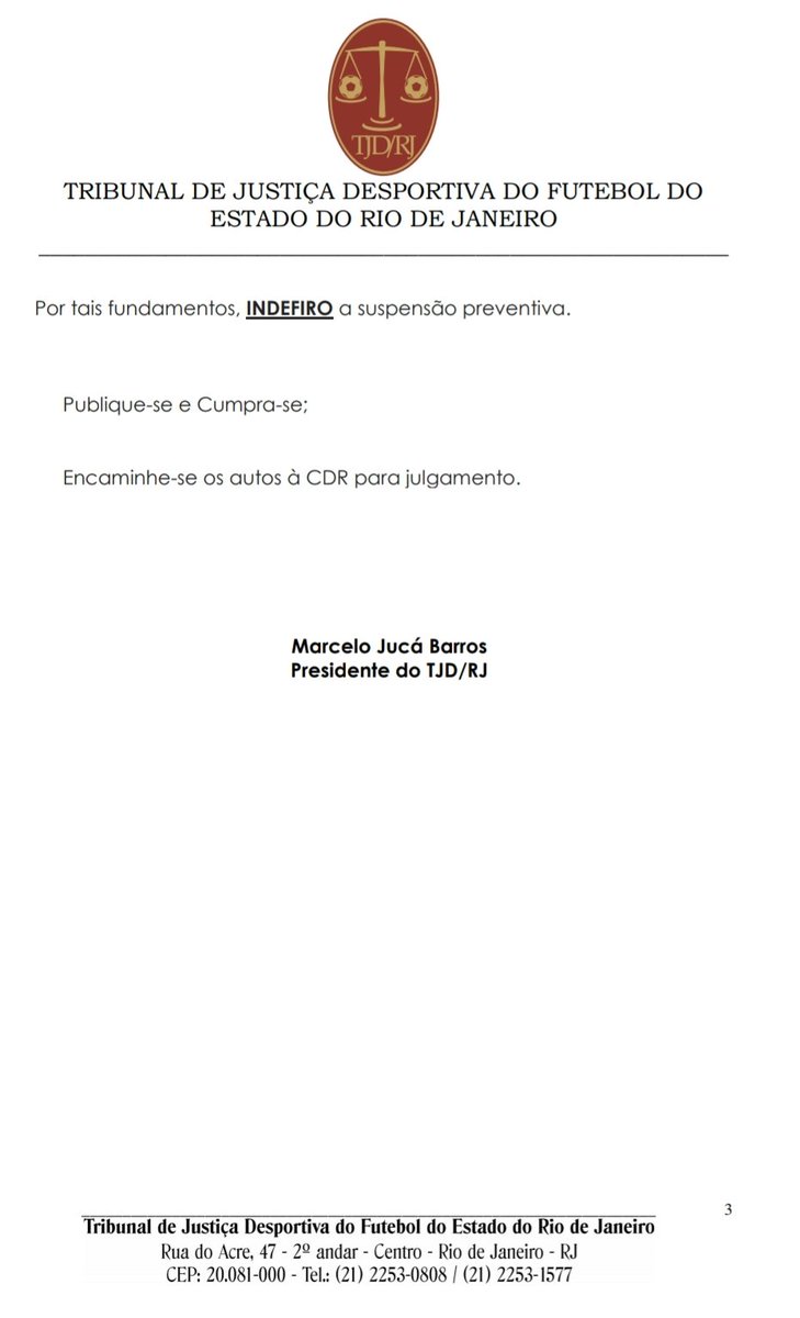 Presidente do TJD/RJ, Marcelo Jucá indefere a suspensão preventiva em pedido de liminar na denúncia da Procuradoria do TJD/RJ, que quer a exclusão do Fluminense no Campeonato Carioca pelo artigo 231. Definição, com isso, fica para julgamento - depois da defesa. Espia #lanceFLU