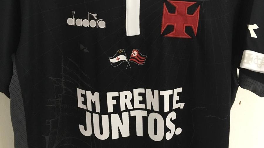 Além do símbolo rubro-negro, a camisa tinha a frase "em frente, juntos" e "SOS Vidigal Rocinha".