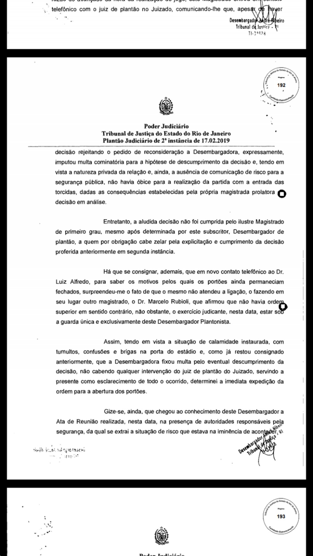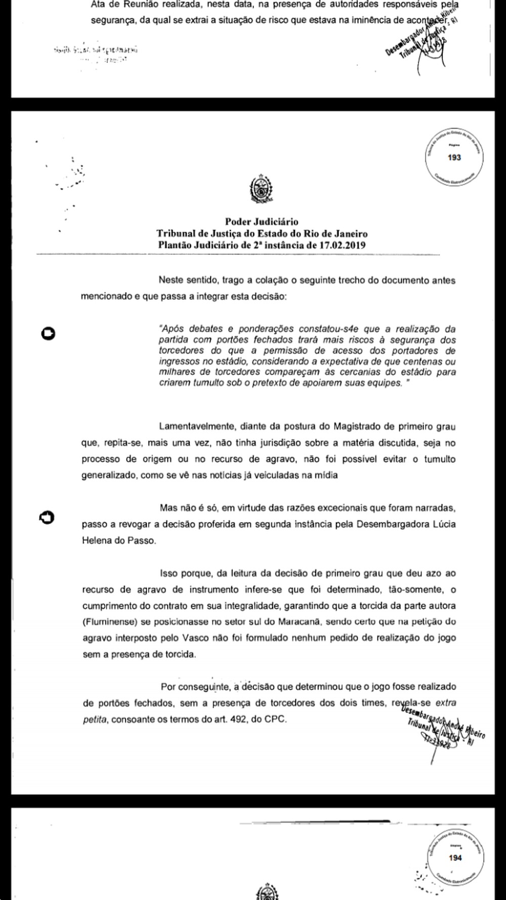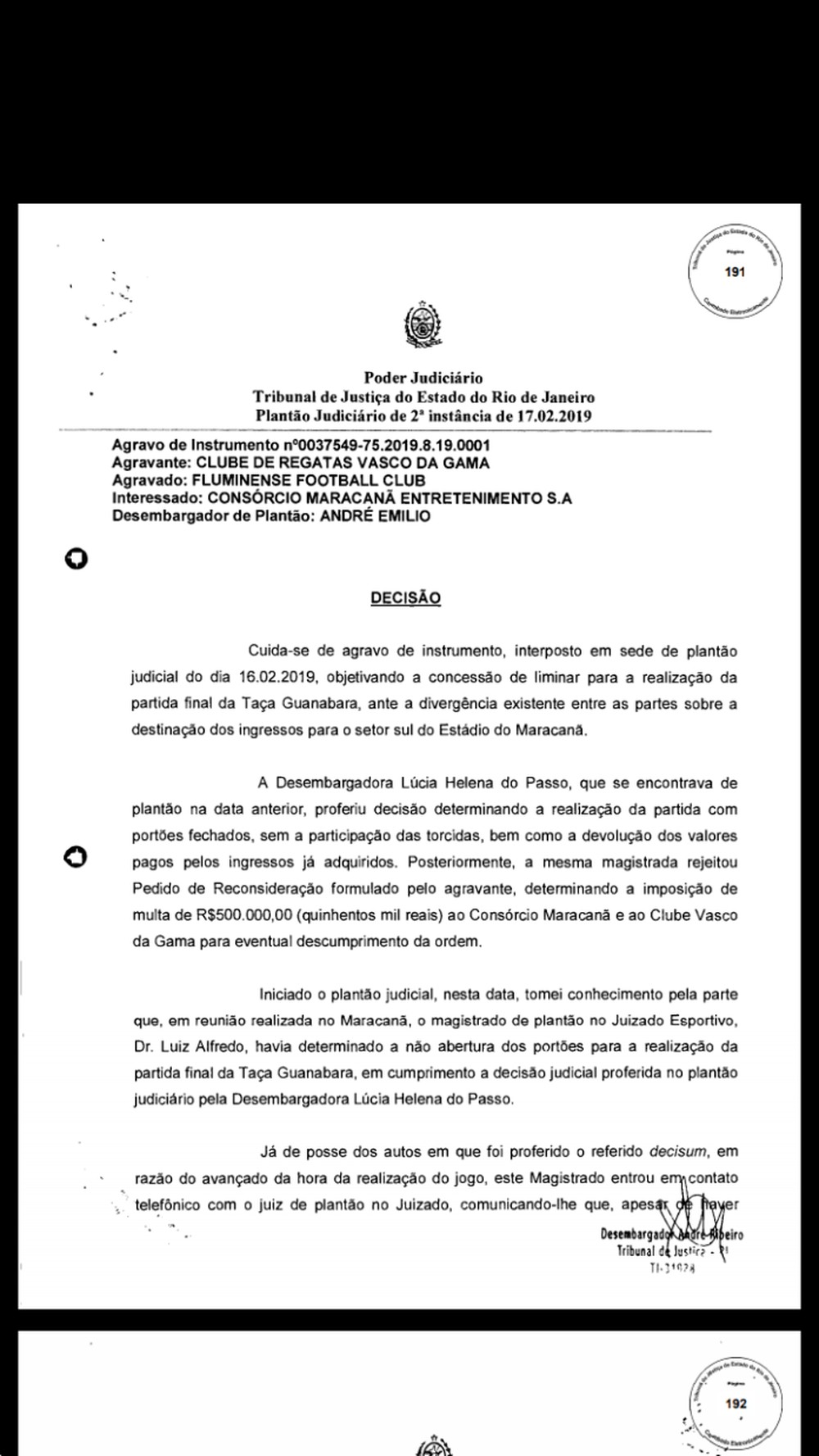 Enquanto Vasco e Fluminense disputavam os minutos iniciais da final da Taça Guanabara, no último domingo, torcedores do Cruz-Maltino e policiais entravam em conflitos do lado de fora do Maracanã, que tinha portões fechados por decisão da desembargadora Lúcia Helena do Passo. Em um agravo de instrumento, porém, o desembargador André Emilio alegou "calamidade instaurada, com tumultos, confusões e brigas" e ordenou a abertura dos portões.
