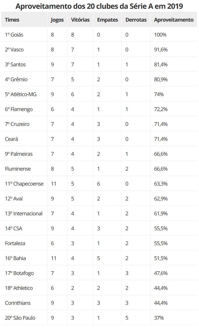 O líder do ranking é o Goiás, único com 100% de aproveitamento: são oito vitórias em oito jogos. O Vasco, campeão da Taça Guanabara, aparece na segunda colocação (91,6%), seguido por Santos (81,4%) e Grêmio (80,9%).