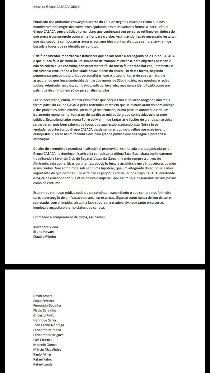 Enraizado nas profundas convicções acerca do Club de Regatas Vasco da Gama que nos mantiveram por longos dezenove anos ajudando das mais variadas formas a Instituição, o Grupo CASACA vem a público tornar claro que continuará seu percurso retilíneo em defesa do que preza e compreende como o melhor para o clube. Assim sendo, faz-se necessário ressaltar que não coaduna com posturas avessas aos seus ideais primordiais que sempre serviram de bússola a todos que se identificam conosco.