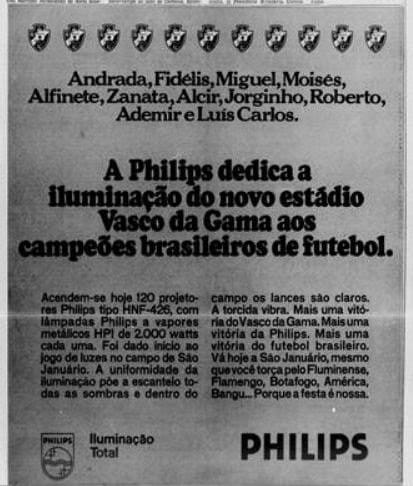 O Vasco estaria próximo de anunciar uma parceria com a Philips para a modernização dos refletores de São Januário. Se as informações se confirmarem, não será a primeira vez que isso acontece. Na década de 1970, a empresa holandesa atuou na reforma do sistema de iluminação do estádio e publicou o anúncio abaixo quando da inauguração.