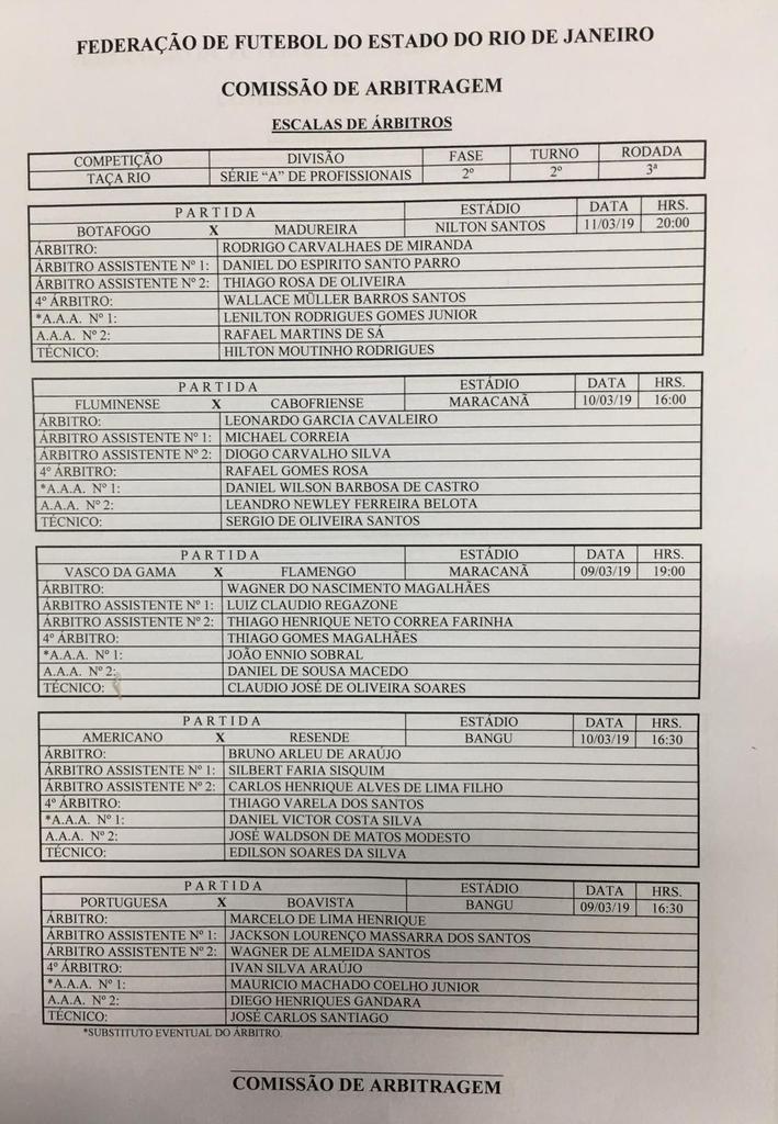 Escala de arbitragem dos jogos da terceira rodada da Taça Rio.
