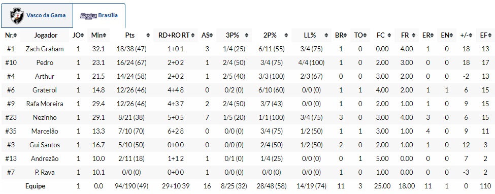 Com 18 pontos marcados, Zach Graham foi o cestinha da partida, seguido por Pedro, com 16, e Arthur, com 14. Pelo lado do Vasco, Duda foi o maior pontuador com 13 pontos, um a mais que Caio Torres e Vithinho.