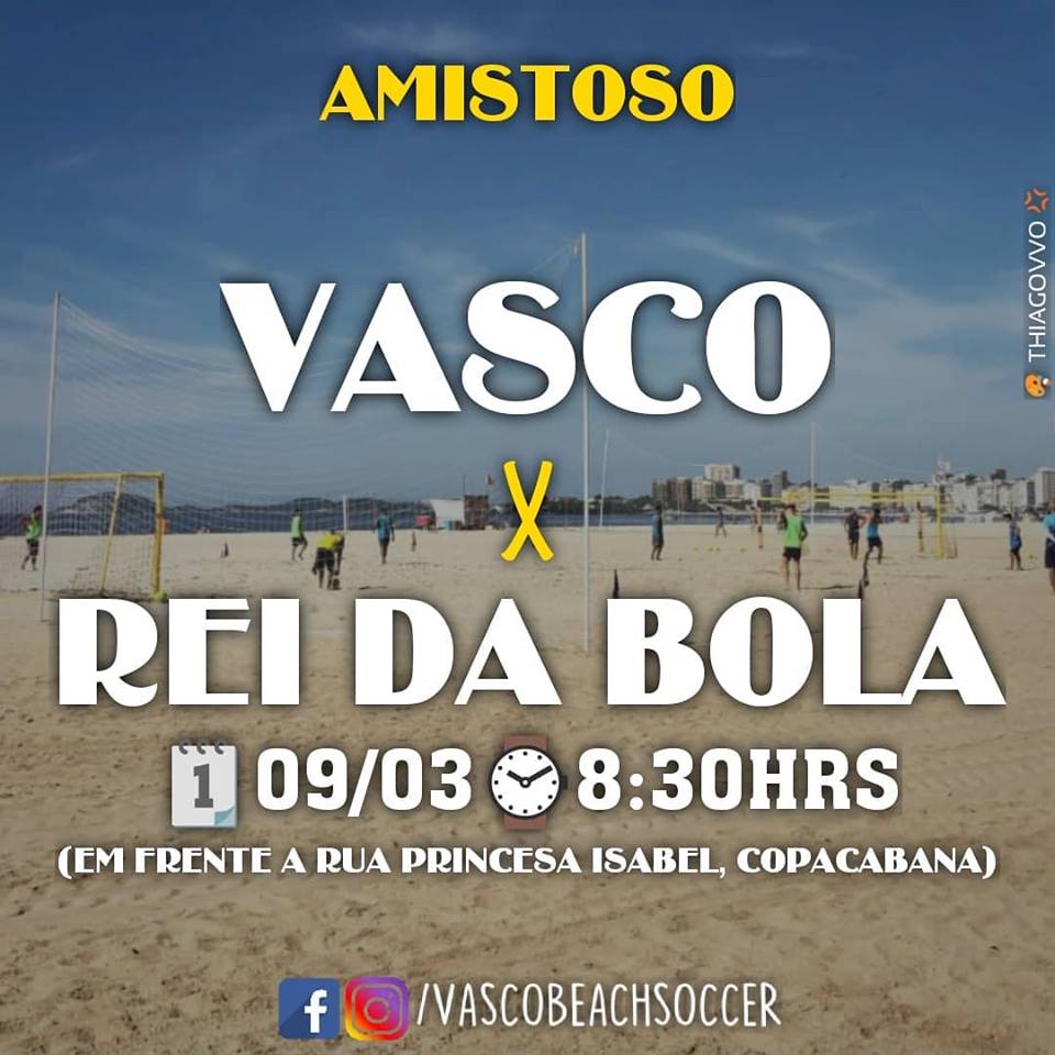 Neste sábado 09/03, as 8:30 horas, o Vasco Beach Soccer fará um amistoso contra a equipe do Rei da Bola visando a preparação e últimos ajustes para o campeonato Carioca 2019, a partida será realizada em frente a Rua Princesa Isabel.