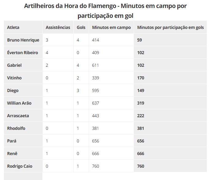 Por questão de justiça, alguns rankings do Espião Estatístico consideram apenas jogadores que atuaram pelo menos 40% do tempo de quem mais atuou. Em uma comparação entre jogadores do Flamengo, entre quem participou de gol, foi Rodrigo Caio quem mais tempo atuou, com 760 minutos em campo. Assim, Berrío, Henrique Dourado (que já deixou o clube), Trauco e Uribe ficam de fora por terem jogado menos de 305 minutos.. Berrío jogou 31 minutos apenas e fez um gol. Ficaria difícil alguém superar esse desempenho.