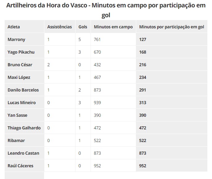 No Vasco, quem atuou mais entre os que participaram de gol foi Raúl Cáceres, 952 minutos. Assim, fica de fora quem atuou menos de 381 minutos. Por isso, Rossi e Dudu não aparecem no ranking.