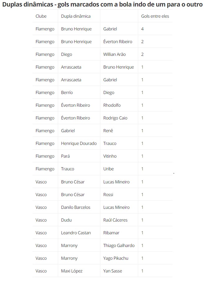 Não é segredo para ninguém: no Flamengo, a Dupla Dinâmica é Bruno Henrique e Gabriel. Foram quatro gols com assistências de um deles para gol do outro. Também porque houve menos gols de assistência no Vasco, não houve nenhuma dupla que conseguiu mais de um gol com a bola indo de um para o outro finalizar e marcar. Veja a lista: