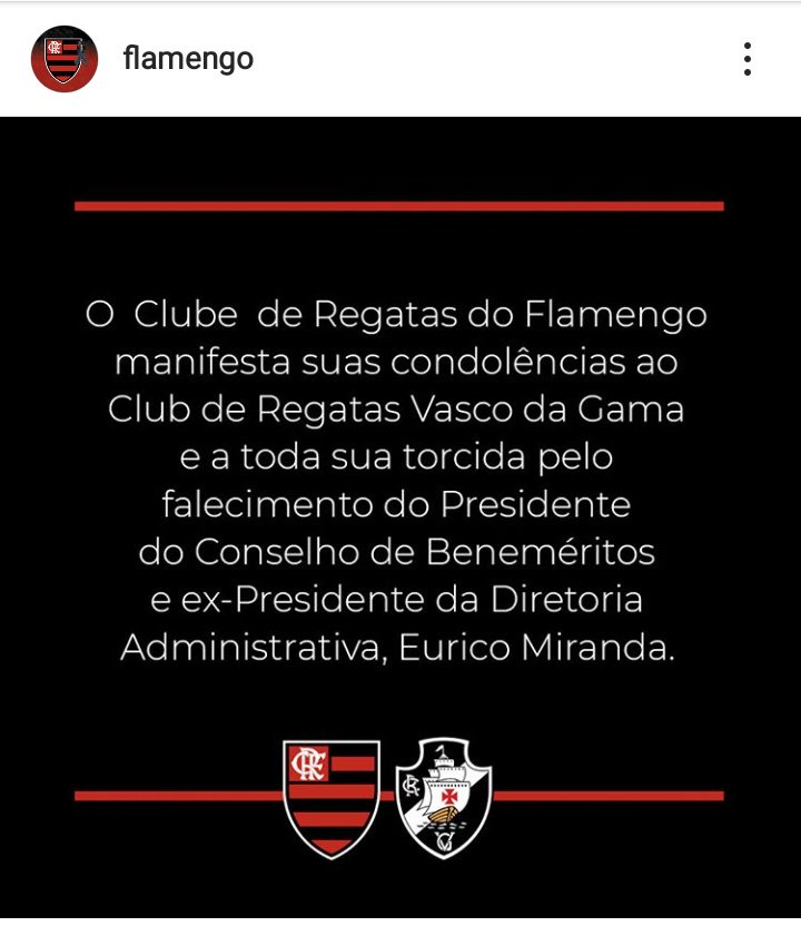 O Clube de Regatas do Flamengo manifesta suas profundas condolências ao Club de Regatas Vasco da Gama e a toda sua torcida pelo falecimento do ex-presidente e Presidente do Conselho de Grandes Beneméritos, Eurico Miranda