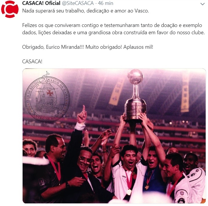 Site Casaca, sobre Eurico: 'Nada superará seu trabalho, dedicação e amor ao Vasco'