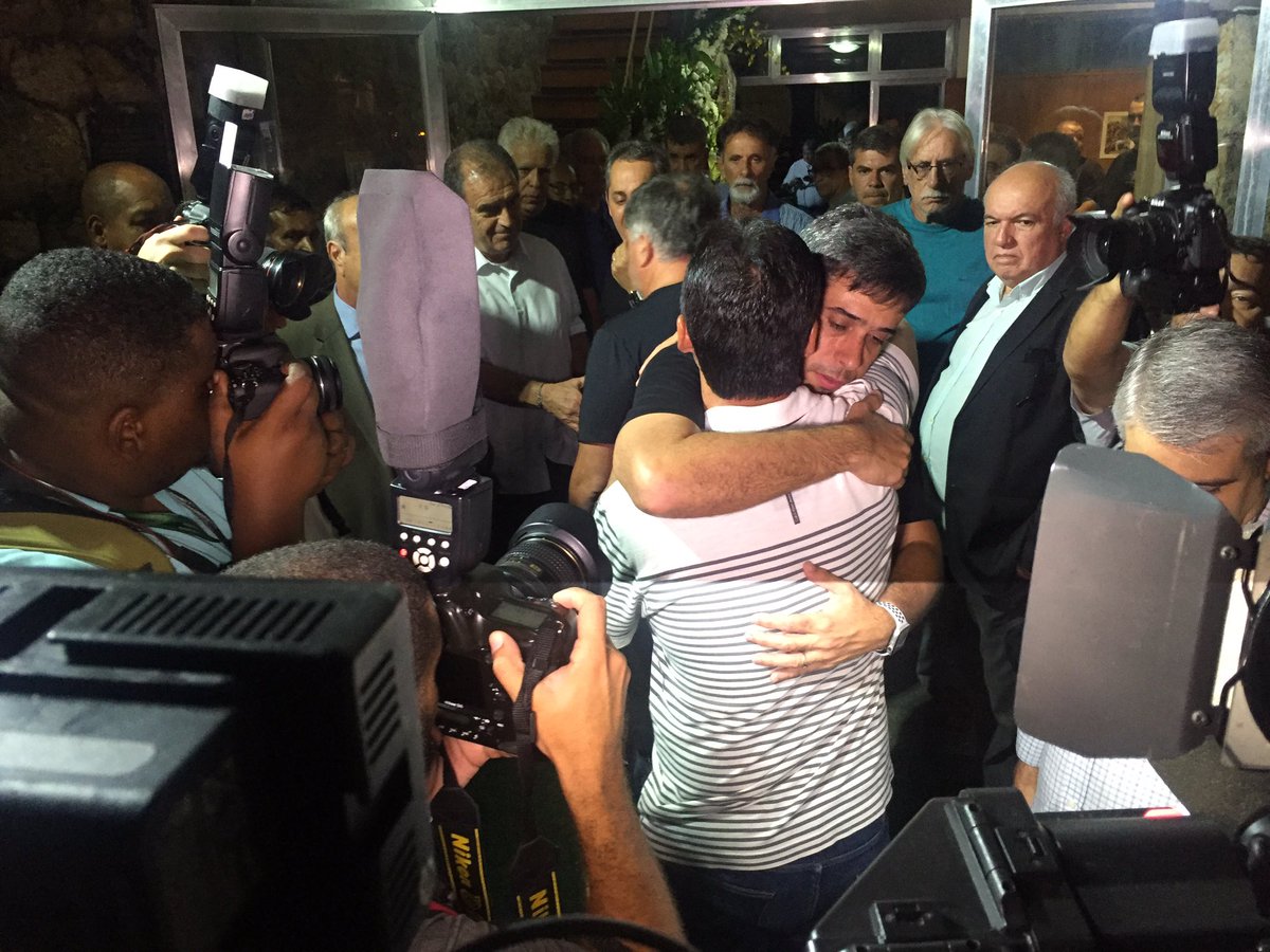 Zé Ricardo presta solidariedade a Euriquinho em rápida passagem pelo velório de Eurico Miranda