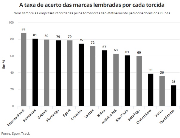 É por isso que, a partir das marcas mencionadas pelos torcedores, a Sport Track faz a distinção de quais delas foram efetivamente patrocinadoras dos clubes no decorrer da temporada. A taxa de acerto é diferente de clube para clube. Enquanto os torcedores de Internacional, Palmeiras e Grêmio têm os melhores percentuais, acima dos 80% cada, Corinthians, Vasco e Fluminense apresentam aproveitamentos baixos.