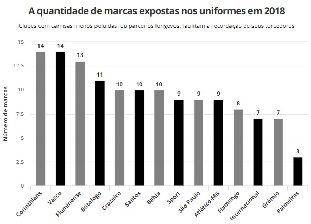 Não é por acaso que os torcedores de Fluminense, Vasco, Corinthians e Botafogo apresentem as menores taxas de lembranças corretas. Foram esses os clubes a colocar mais marcas no uniforme em 2018.