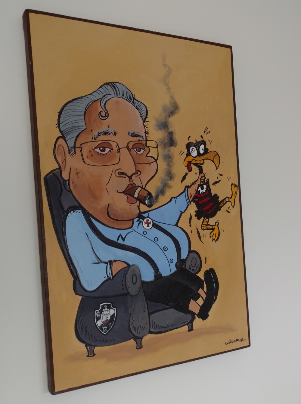 O cartola apontava para um quadro acima de nossas cabeças, no qual havia uma caricatura de si mesmo a estrangular um urubu flamenguista.