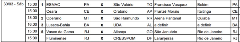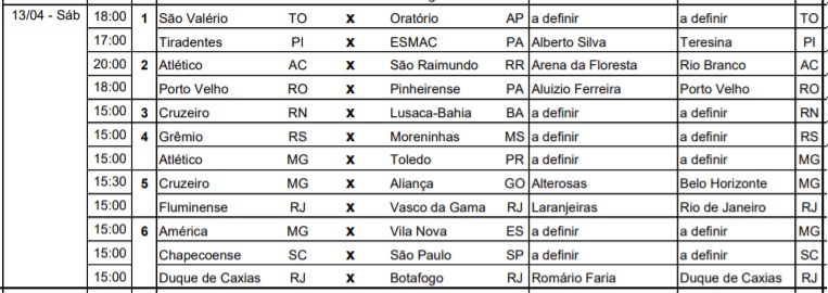 O documento detalha datas, horários e locais do duelos. A primeira rodada segue nos dias 28, 30 e 31 de março. Os jogos da segunda rodada começam no dia 10 de abril (quarta-feira).