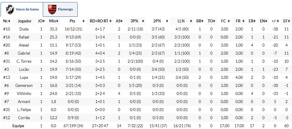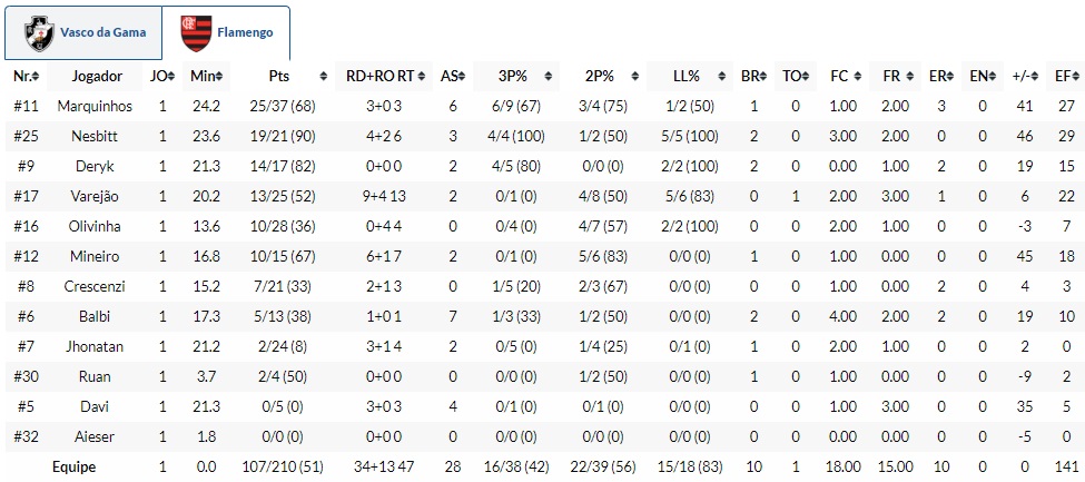 Com 25 pontos marcados, Marquinhos foi o cestinha da partida, seguido por Nesbitt, com 19. Pelo Vasco, Duda Machado foi o maior pontuador, com 16. Com um duplo-duplo (13 pontos e 13 rebotes), Anderson Varejão foi outro jogador com atuação destacada neste sábado, assim como Deryk, que pontuou 14 vezes.