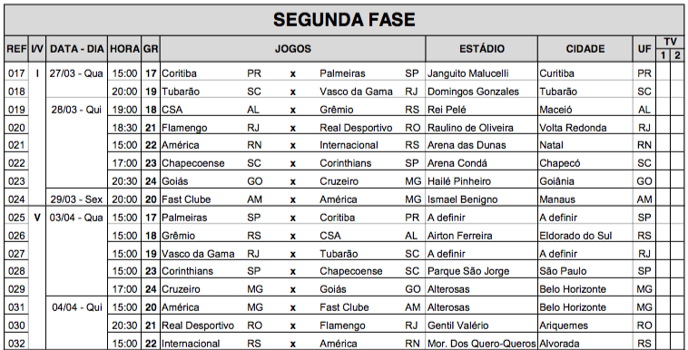O confronto que abre as oitavas de final, entre Coritiba e Palmeiras, será no Estádio Janguito Malucelli, às 15h. No mesmo dia, Tubarão-SC e Vasco se enfrentam Estádio Domingos Gonzales, às 20h. CSA-AL, Grêmio, Flamengo, Real Desportivo-RO, América-RN, Internacional, Chapecoense, Corinthians, Goiás, Cruzeiro, Fast Clube-AM e América-MG também conheceram datas, horários e locais de seus duelos.