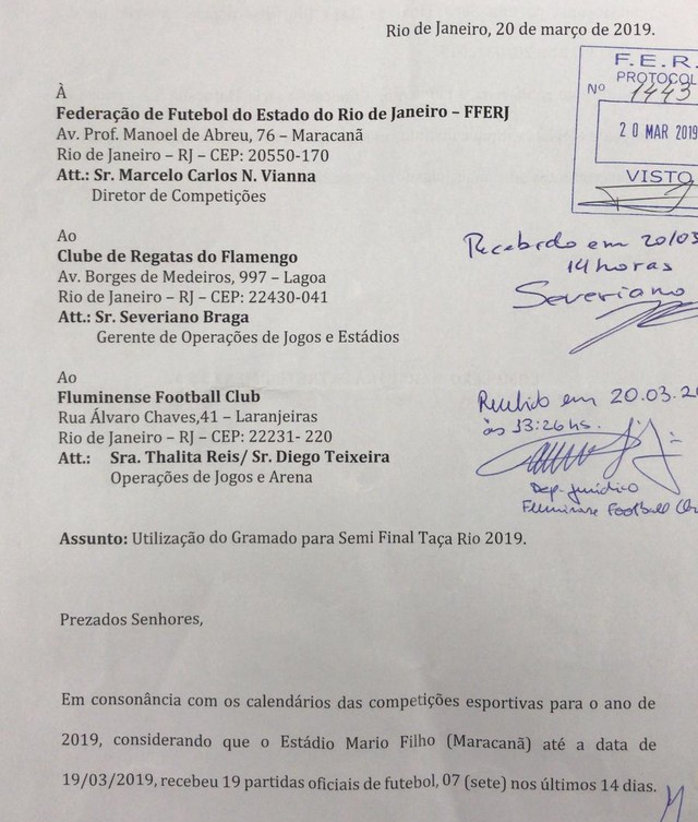 A Ferj, imediatamente após receber o ofício, encaminhou uma equipe de vistoria ao estádio para avaliar as condições do gramado. O presidente da entidade, Rubens Lopes, afirmou que o comunicado causou "estranheza", visto que as datas foram divulgadas com antecedência.