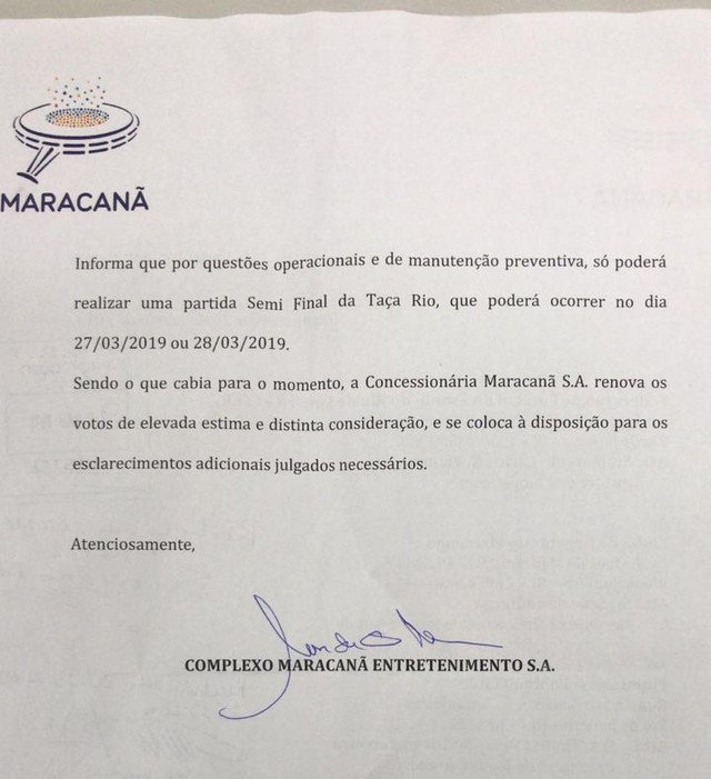 Três dias após o Governo do Estado do Rio de Janeiro anunciar o fim da concessão do Maracanã, a concessionária que administra o estádio enviou à Federação de Futebol do Rio (Ferj), ao Flamengo e ao Fluminense, clubes com os quais mantém relação contratual, um ofício no qual expõe a impossibilidade de realizar no estádio os dois jogos da semifinal da Taça Rio, o segundo turno do Campeonato Carioca. O documento informa que só será possível realizar uma das partidas previstas, ou no dia 27, ou no dia 28 deste mês.