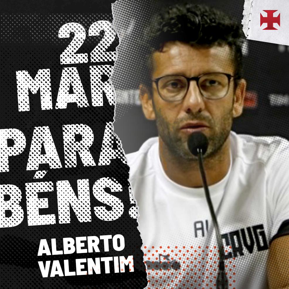 Via Twitter, Vasco parabeniza o treinador Alberto Valentim pelo aniversário