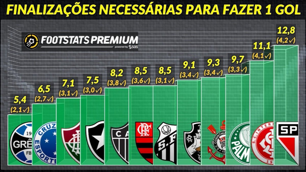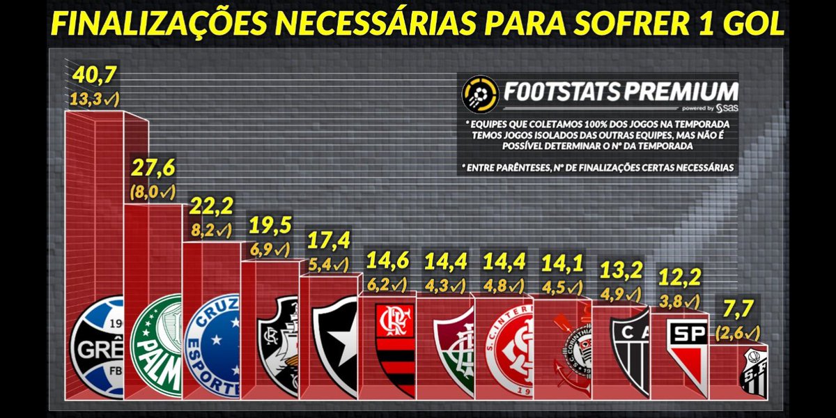 Quantas finalizações são necessárias p/ fazer e p/ sofrer 1 gol?