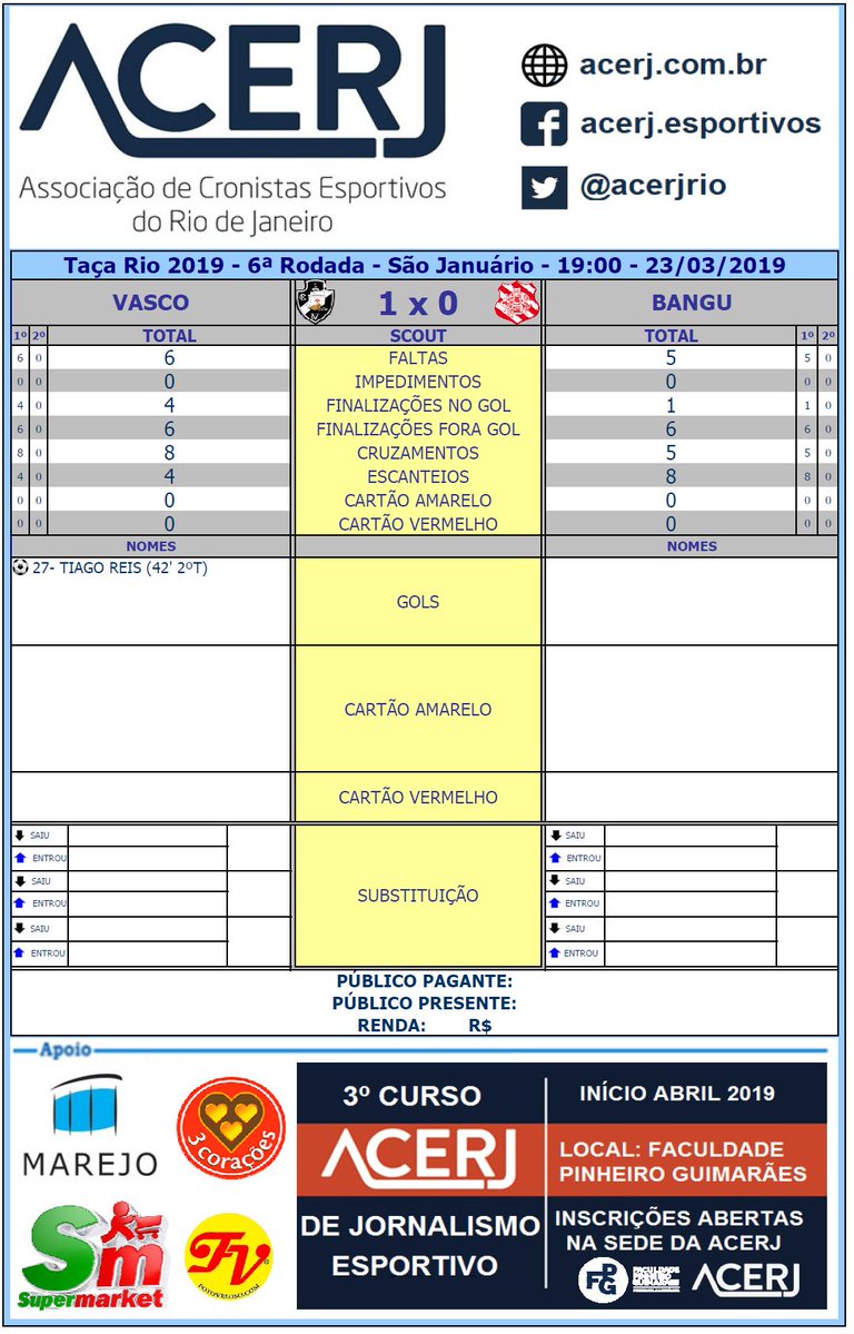 Scout do 1º Tempo de Vasco e Bangu pela 6ª Rodada da Taça Rio 2019 em São Januário #acerjinforma #VASxBAN #cariocão2019 #omaischarmoso #omaisvisto