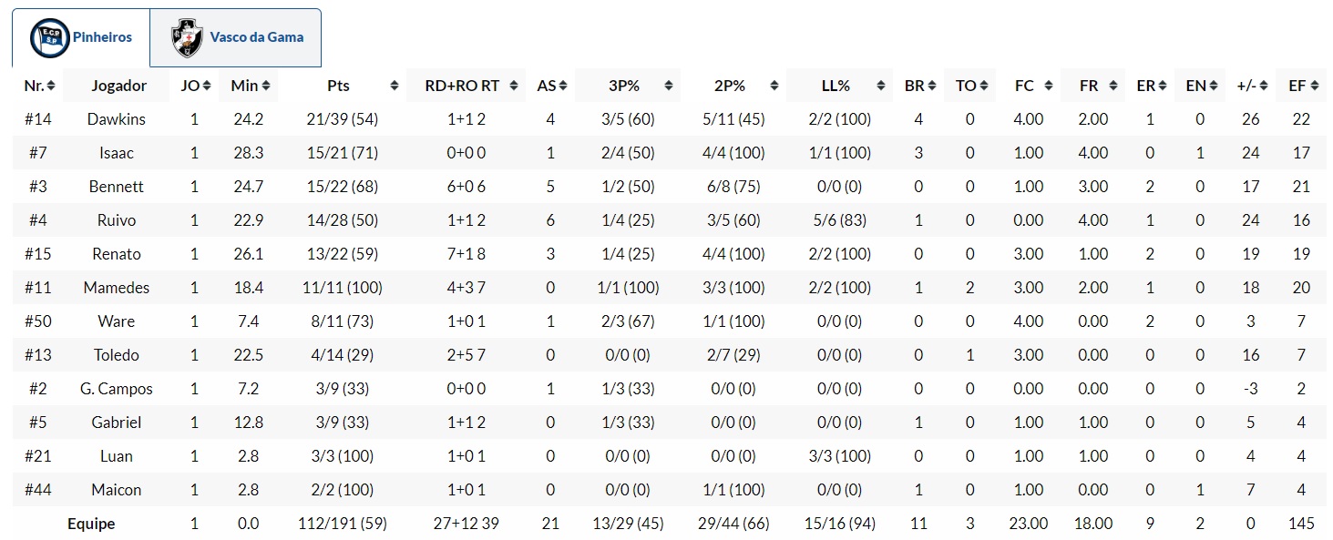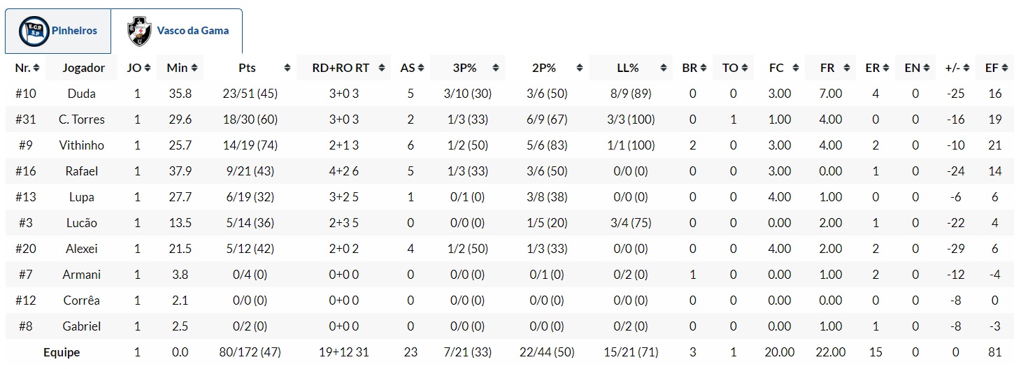 O Vasco encerrou sua participação no Novo Basquete Brasil 2018/2019 nesta terça-feira (26/3) com derrota para o Pinheiros, por 112 a 80, no Ginásio Poliesportivo H. Villaboim. O destaque vascaíno foi o ala-armador Duda Machado, com 23 pontos e cinco assistências.