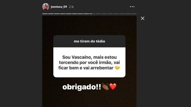 'Sou vascaíno, mais (sic) estou torcendo por você, irmão, vai ficar bem e arrebentar'.