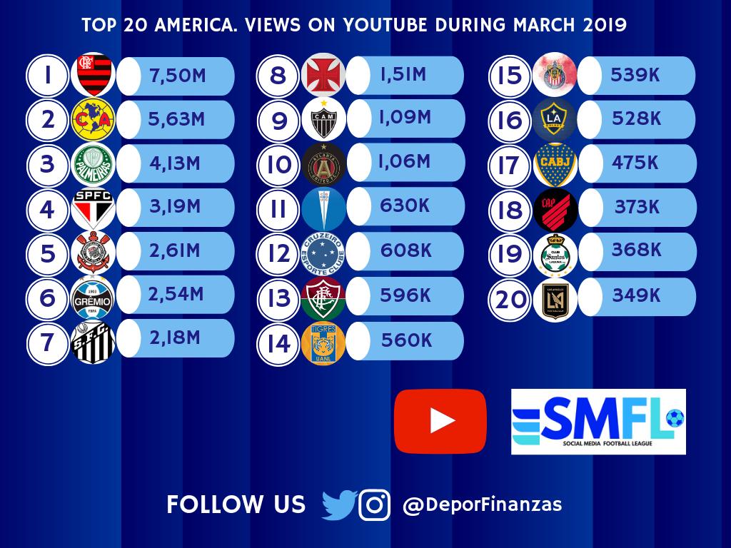 💻SOCIAL-MEDIA | ⚽️ ¡Los 20 clubes de América con más visualizaciones en #youtube durante marzo 2019!
